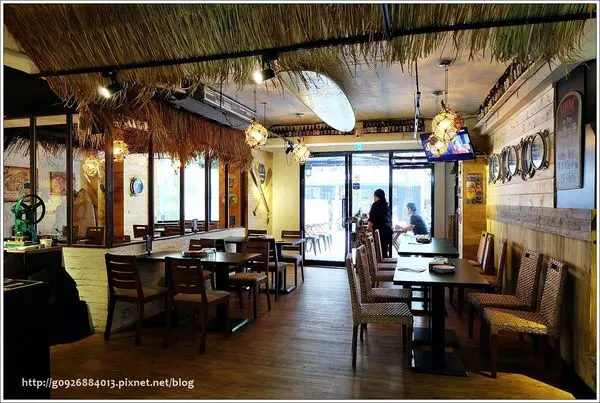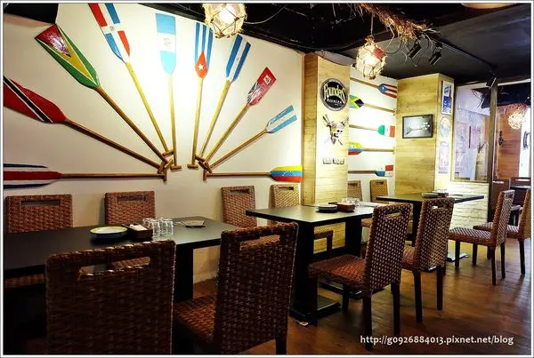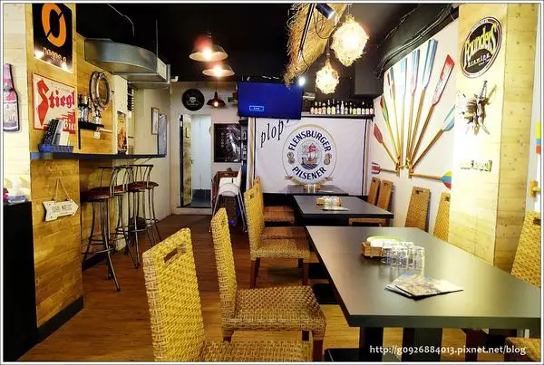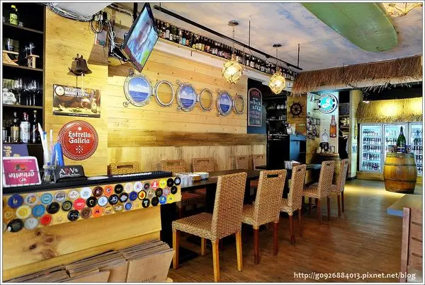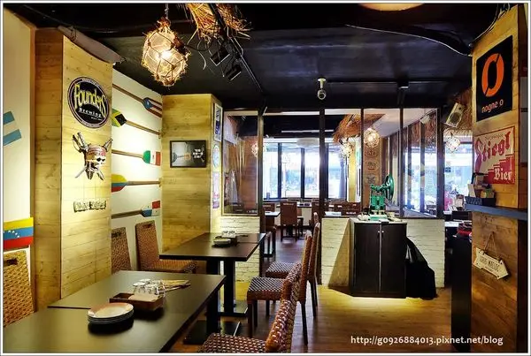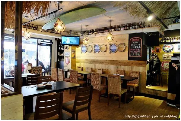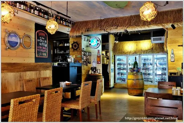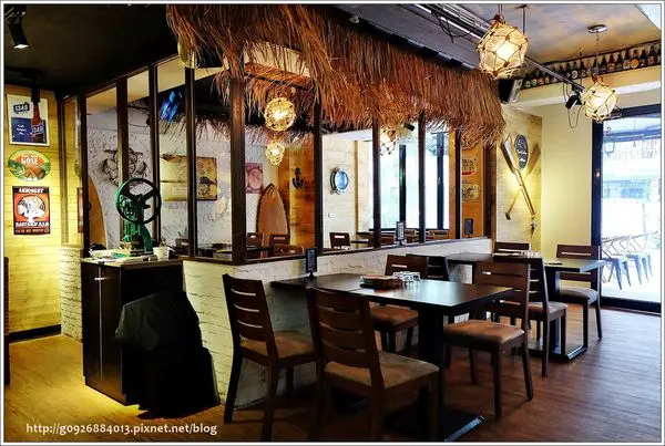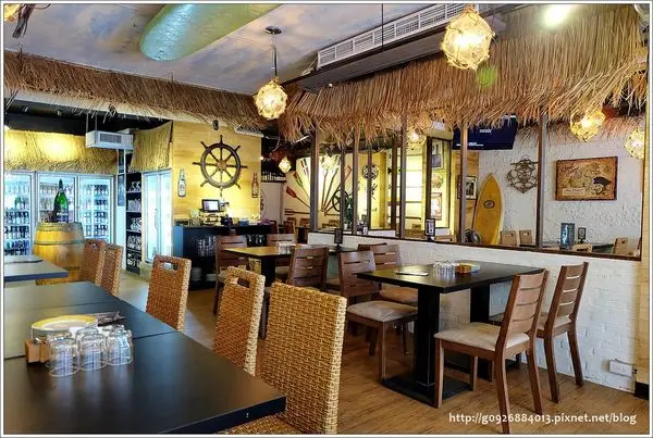 結合船舵、船窗、衝浪板、滑槳、錨...等元素,加上木質牆面及桌椅