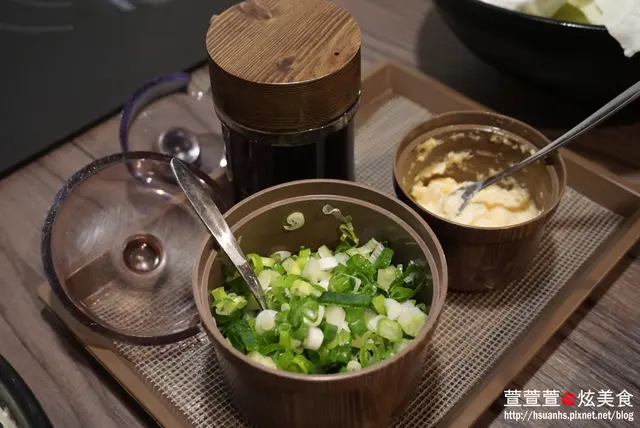 桌上有新鮮蔥花、蒜泥和醬油,可以自行調製醬料