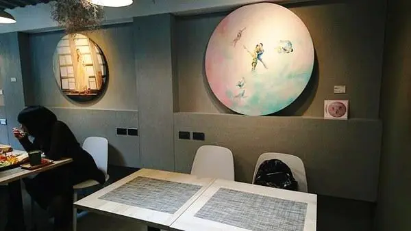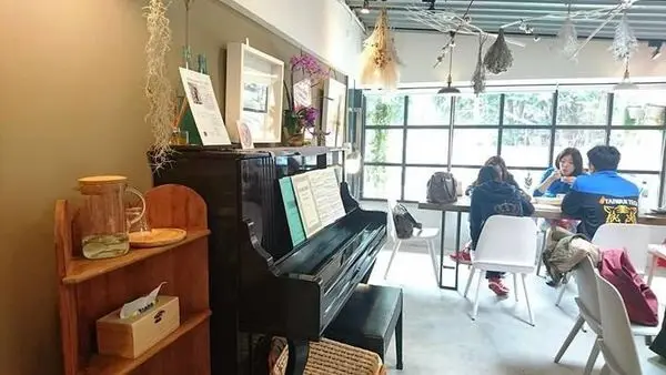 座位區也分成兩區,一進去只看到部分座位,我們坐的這一區是在拉門之後,原來拉門打開的風景這麼美。有一大片的對外格紋窗、一台鋼琴、天花板上的乾燥花飾和牆面的藝術畫作,每一處都妝點很細緻,這麼夢幻的空間也常被租借為外拍或是展覽空間喔。