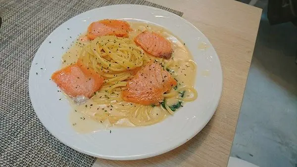 朋友點的白醬煙燻鮭魚義大利麵,稠密濃香的奶油白醬看起來很美味。