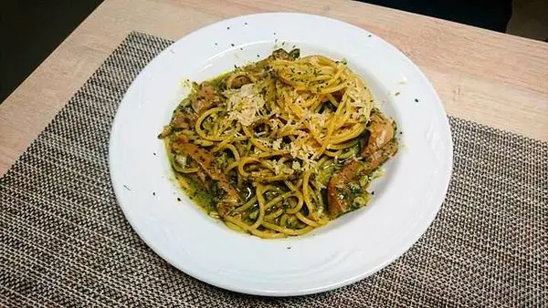 另一位朋友的青醬迷迭香雞腿排義大利麵,同樣香氣十足,偷嚐了一口,很是美味呀!醬汁和麵條融合的剛剛好,青醬醬汁濃香,麵條又十分彈牙。不過雞腿排和我們想像的不同,以為是很大塊的肉呀(笑)。但雞肉肉質的厚實有勁口感還是挺不錯的。