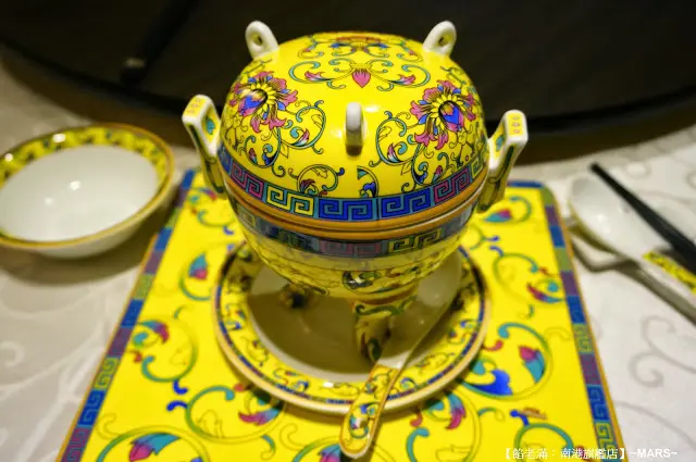 以一人一盅的適量上桌的京味佛跳牆,在這黃底紋路交錯著富有宮廷特色的小盅,揭開的那一剎那,豐富滿盛的佛跳牆迎面而來,眾多的高級食材如干貝、烏蔘、花膠等來耐心烹饌而成的料理,就是讓人食指大動也大讚的美好料理,每一湯匙上匙入口後,來品味到的不同食材透過小火精燉交錯出來的滋味,讓人回味無窮。