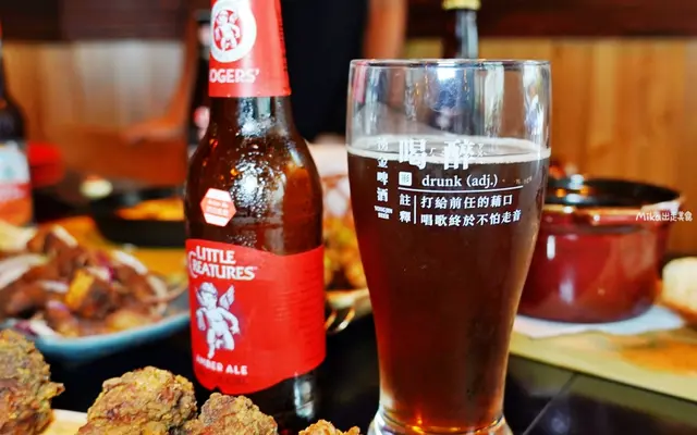 因為是先選精釀啤酒,然後再去挑適合搭配的下酒菜,因此會是以精釀啤酒為主,餐點為輔。這一款Little creatures Rogers 酒花精靈琥珀啤酒,酒精濃度是輕量級的,比較偏麥芽風味,帶一點點焦糖、太妃糖香氣,很適合跟炸雞炸過的皮之類的醬香味做組合,而且甜麥芽味能中和油膩。