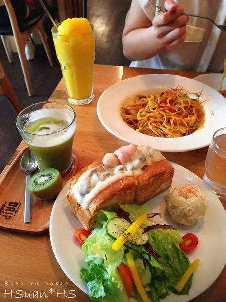 蔬果汁、芒果冰沙、義式三杯雞肉麵、牛肉起司三明治、香蕉巧克力可拿滋