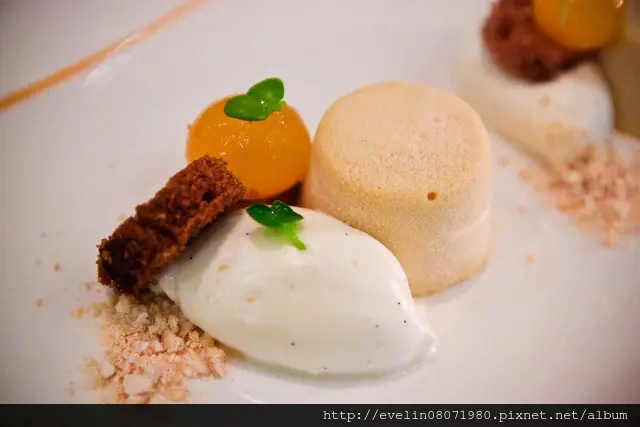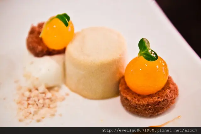 甜點搭備的柑橘球屬於分子料理,薄薄的外皮裡面是柑橘汁,