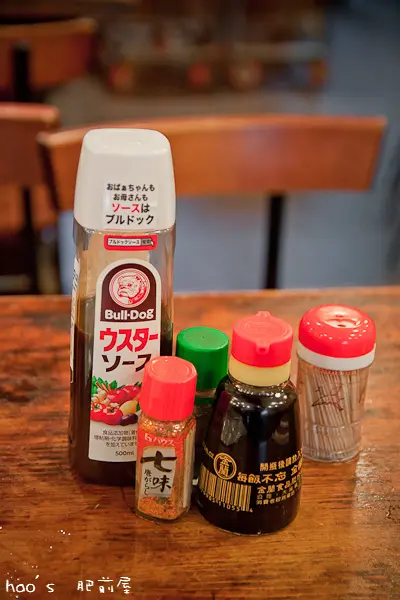 桌上提供著各式醬料調味料如醬油、胡椒、七味粉等。