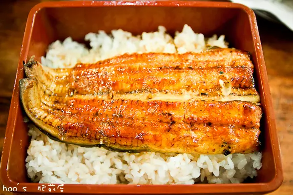 金黃油亮的鰻魚平鋪在白飯上,淋上香濃醬汁,以方型的橘紅食盒盛裝,