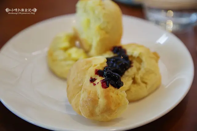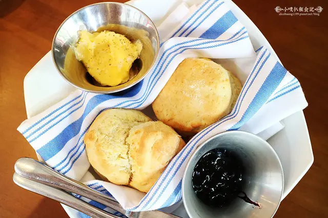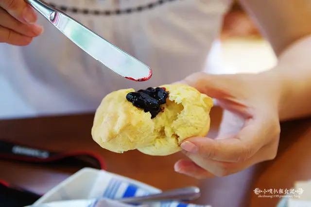 比司吉,品嚐起來,奶香味十足,口感鬆軟美味,充滿濕潤度,一點也不乾澀,搭配一點店家自製的手作藍莓果醬,果醬透出新鮮水果酸甜氣息,甜蜜芬芳,實在讓人還想再來一份呢