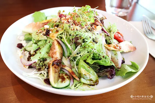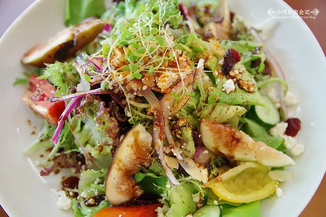 沙拉中有健康的紅藜麥.新鮮無花果.綠捲鬚.番茄.黃椒.紅椒.紫洋蔥.小豆苗...等,澆淋上新鮮的蘋果油醋醬汁