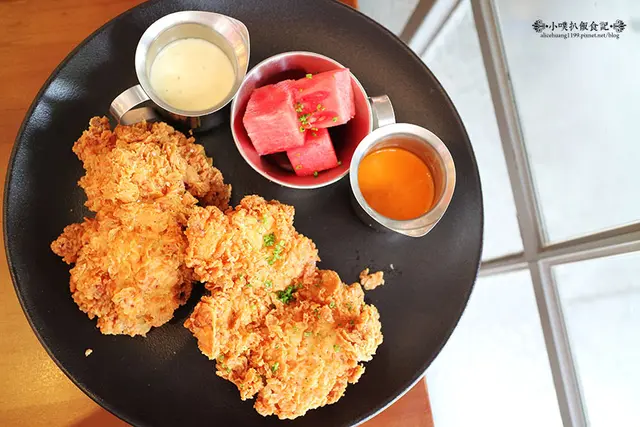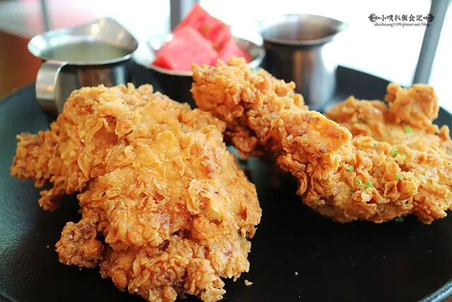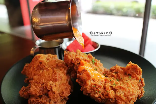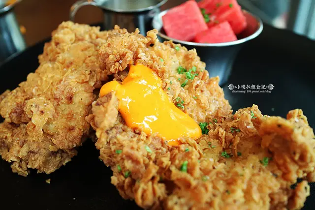 首先,雞隻是選用經典的美式南方炸雞,先用Buttermilk浸潤過後,讓雞肉軟化,再用大蒜.辣椒粉與摩洛哥香料調味,裹上特製南方炸雞酥炸,外皮格外酥脆,內層肉質鮮嫩多汁,搭配檸檬香料調味的酸甜西瓜,清爽不膩