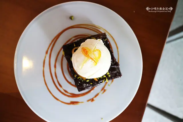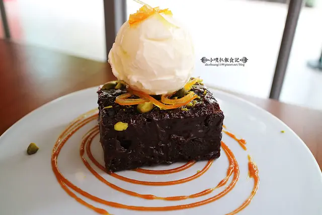 以紮實的黑巧克力蛋糕為基底,上面擺放一顆店家自製的香草冰淇淋,淋上香濃巧克力醬及鹹甜交錯的海鹽焦糖醬