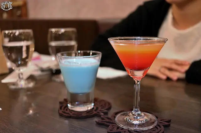 兩杯調酒中橘色那杯取名為幸福存在你我相聚時刻,基底酒為龍舌蘭,