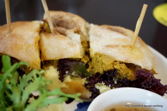 內餡是咖哩鮪魚口味,搭配生菜很是特別,