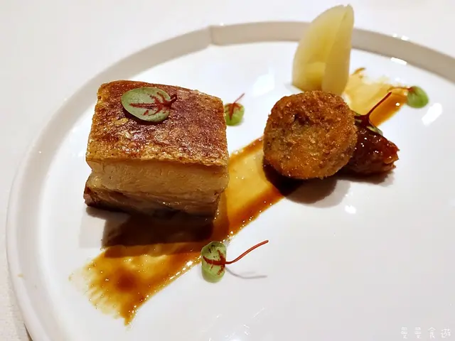 脆皮豬五花、豬肉可樂餅襯西洋梨酸甜醬