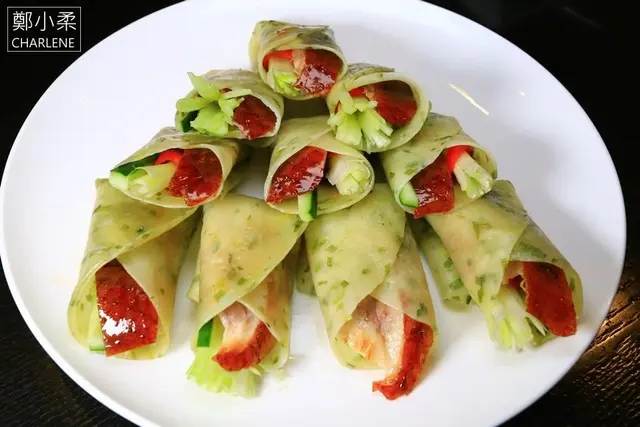 厚度適中而紮實,捲入鮮嫩片皮鴨、獨門秘製的醬料、