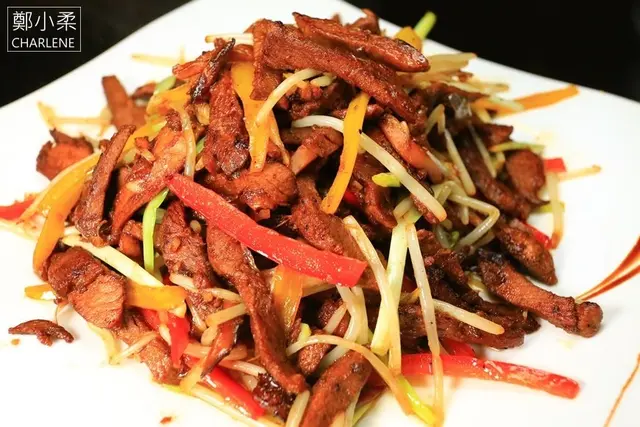 鴨肉絲切成條狀,與豆芽、彩椒大火拌炒,