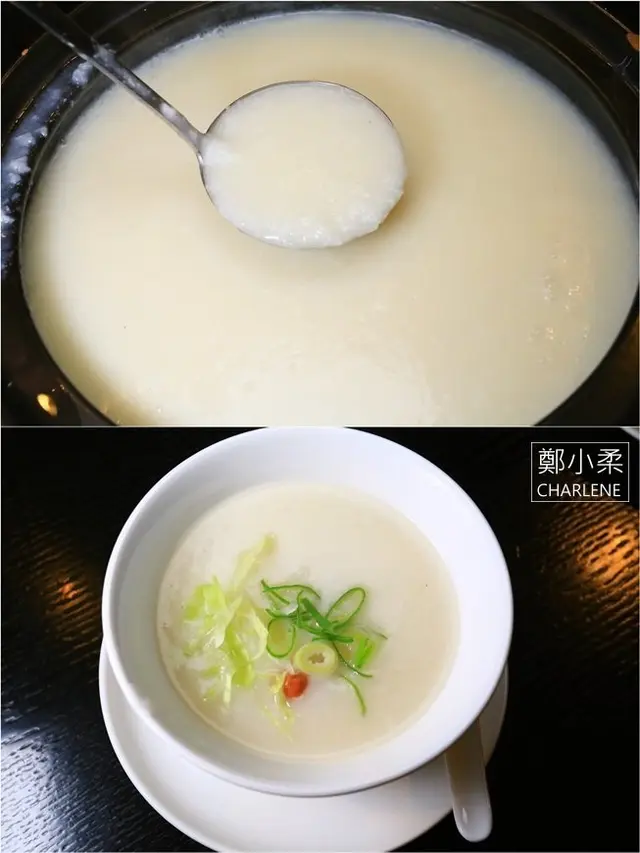 鴨架燉煮成鴨粥,白濁而香醇,微帶黏度,