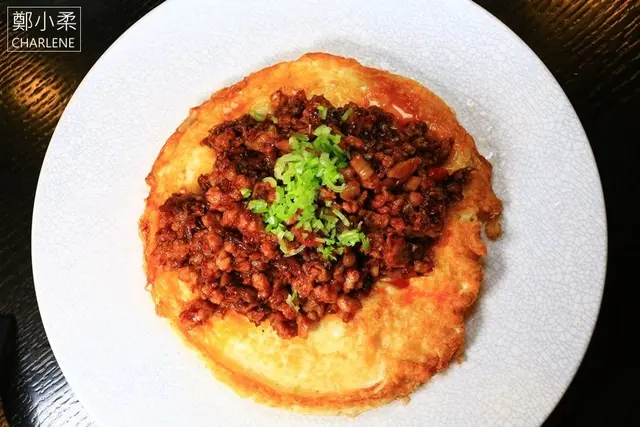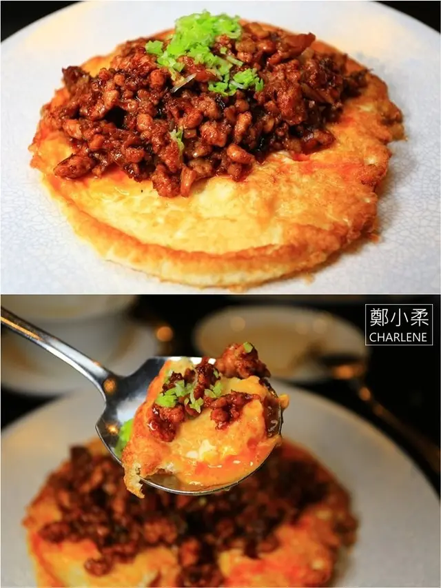 再搭配上XO醬燒肉,芹菜點綴綠意,烘蛋外層呈現微褐,