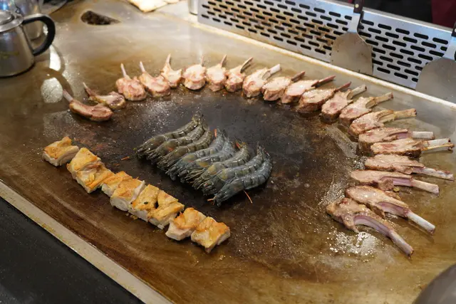 當天的鐵板料理是:法式羊排佐薄荷醬、香料雞腿佐蘑菇醬、草蝦佐辣味茄汁