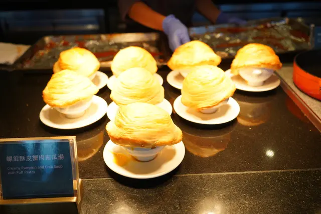 幾乎端上餐台就搶銷一空的酥皮蟹肉南瓜湯、以及酥皮玉米濃湯