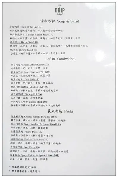 餐點的部分有湯品、沙拉、三明治以及義大利麵等選擇
