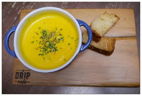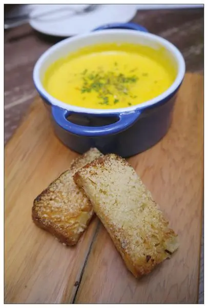 一旁還會附上兩小塊有著酥脆口感的麵包可以沾著濃湯一起吃~