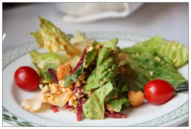 妝點沙拉用的番茄以及讓沙拉吃起的口感更加一致的冰叉美麗的服務生動作優雅的踮起腳並將手中高舉的葡萄酒沙拉醬加入旋轉中的沙拉缽