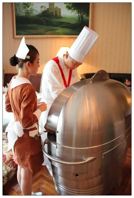 受過專業訓練的牛肋排師傅推著這台要價將近百萬台幣的不銹鋼餐車來到我們的座位旁