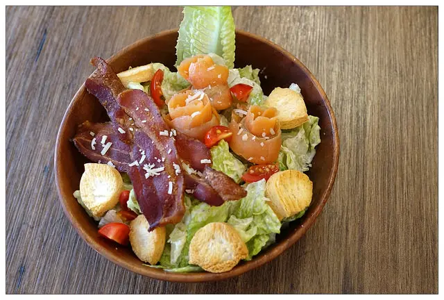 用木碗裝盛的凱薩沙拉份量還不少~適合多人一起分食
