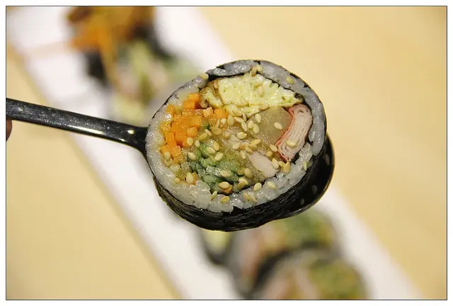 之前我們去韓國的時候他一吃就愛上~~但感覺在韓國吃道的紫菜包飯都很簡單捏!!