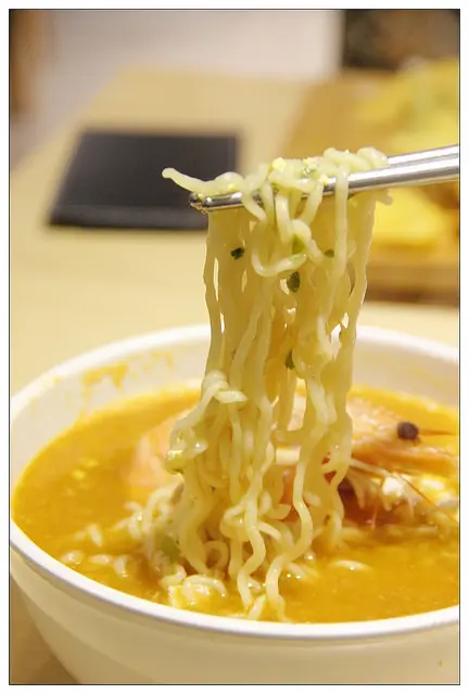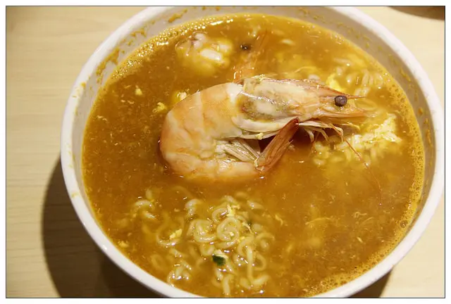 Q彈的拉麵配上肥美的鮮蝦還有魷魚再加上鮮甜又帶辣勁的湯頭