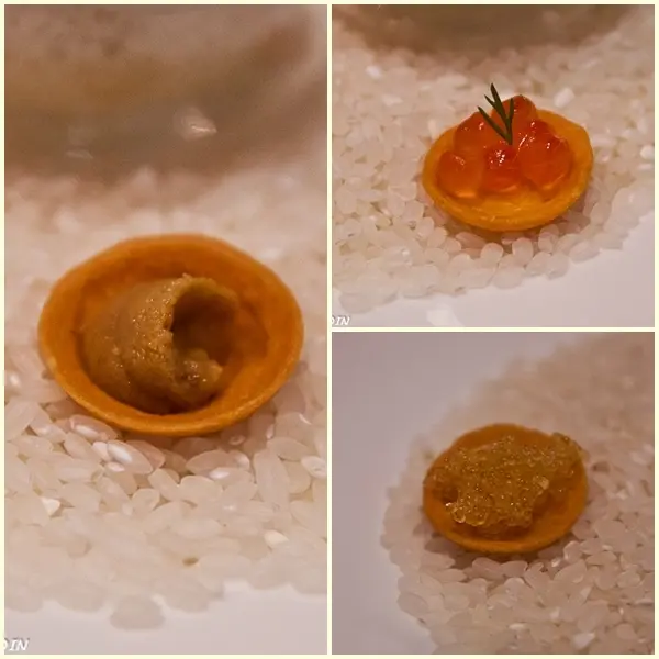 三款小點為飛魚卵、海膽、鮭魚卵,下