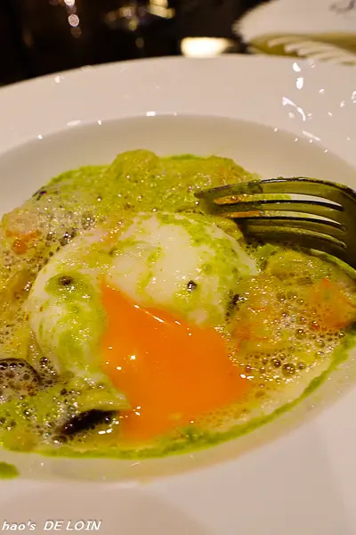 輕輕劃破白嫩的蛋包,橘黃近紅的蛋液混著粉綠色的醬汁,