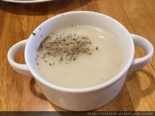 濃湯是馬鈴薯湯,吃得到一點雞蓉與菇菇,湯的溫度蠻燙的~讚!