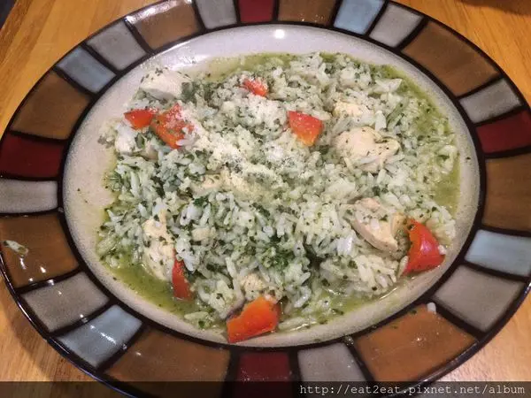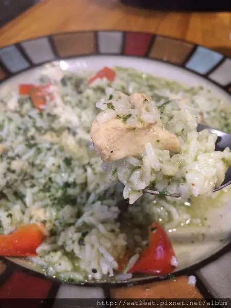 點了今日特餐青醬雞肉燉飯,青醬不油膩雖然味道淡了點但還蠻好吃的,雞肉塊蠻多的!米是長條型的,口感稍硬了些
