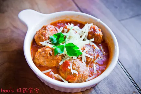 手工牛肉丸佐番茄醬汁,160元。