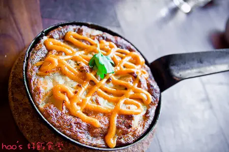 熱騰騰的小鐵鍋,裝著外皮煎得微焦的烘蛋,