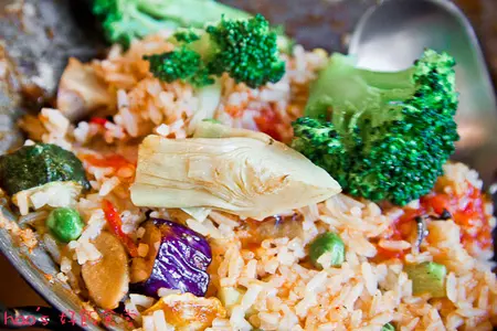 與牛排鍋飯相較,海鮮鍋飯的米粒較乾硬、較香,