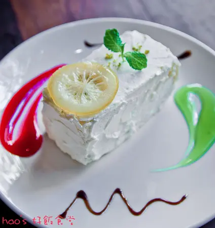 一旁淋上豔紅翠綠醬汁,鮮明亮麗。