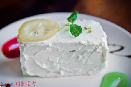 鬆軟的蛋糕抹上雪白糖霜,綴上淺黃色的糖漬檸檬及鮮綠薄荷,