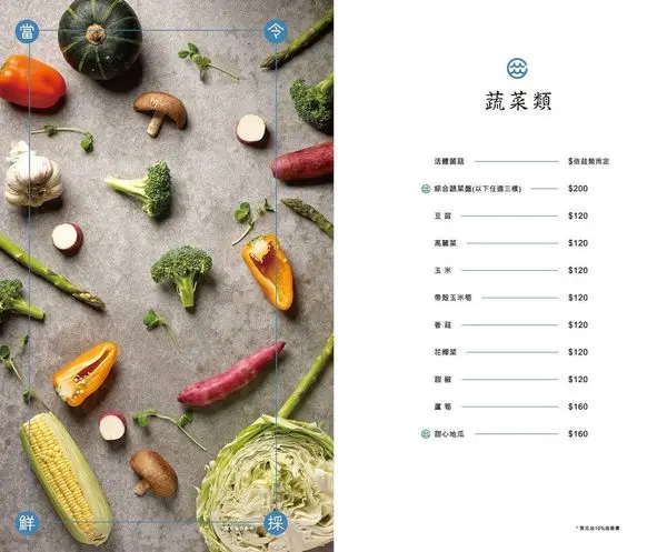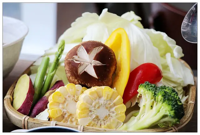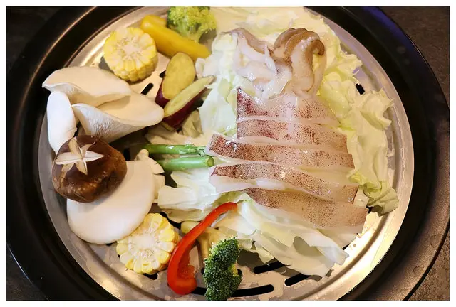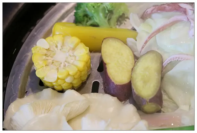 蔬菜盤有高麗菜.鮮香菇.彩椒.玉米.蘆筍.花椰菜.甜心地瓜等
