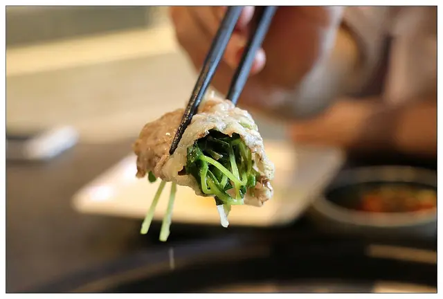 蔡老爺後來發明將綠豆苗捲在牛五花裡一起入口~吃到後來就比較不會膩
