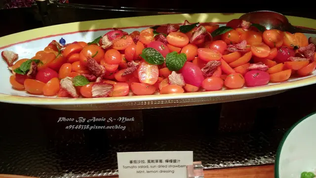 像這個番茄沙拉,加了草莓乾和檸檬汁,酸酸甜甜的,我覺得挺開胃的!
