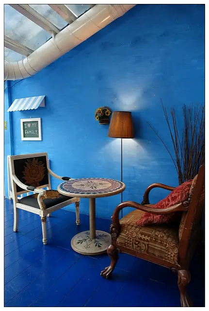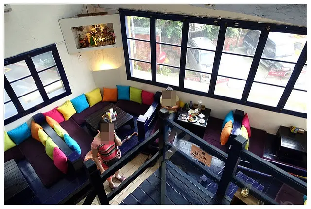 餐廳外觀主要以鮮豔的亮黃色外牆搭配寶藍色窗櫺