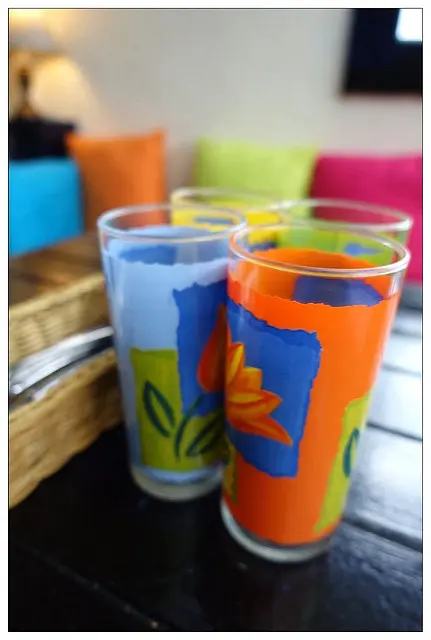 桌上的水杯好繽紛~跟後面的枕頭很搭耶!哈