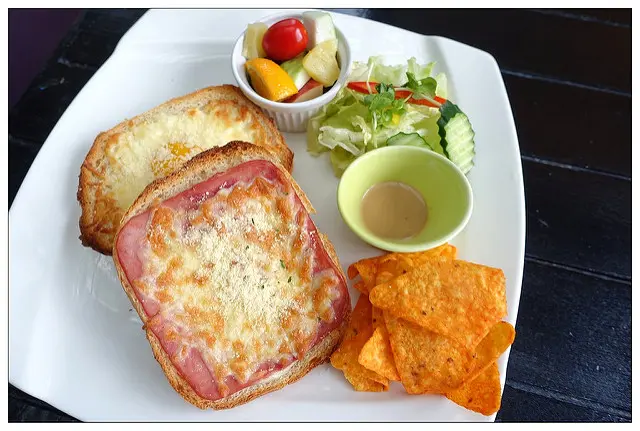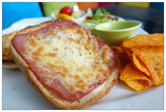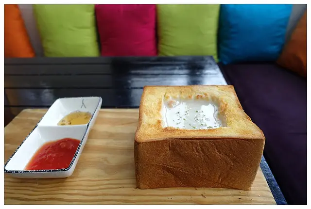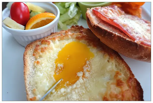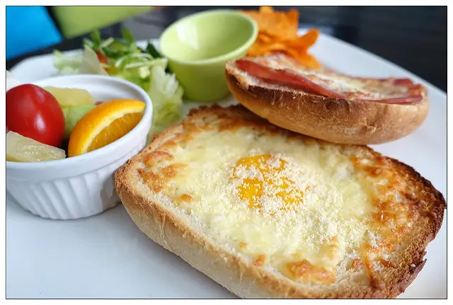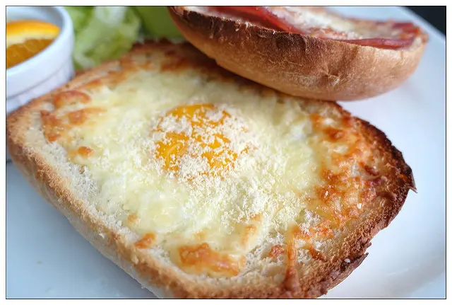 另外一片拖鞋麵包上方則是搭配了邪惡的半熟太陽蛋以及滿滿的起司