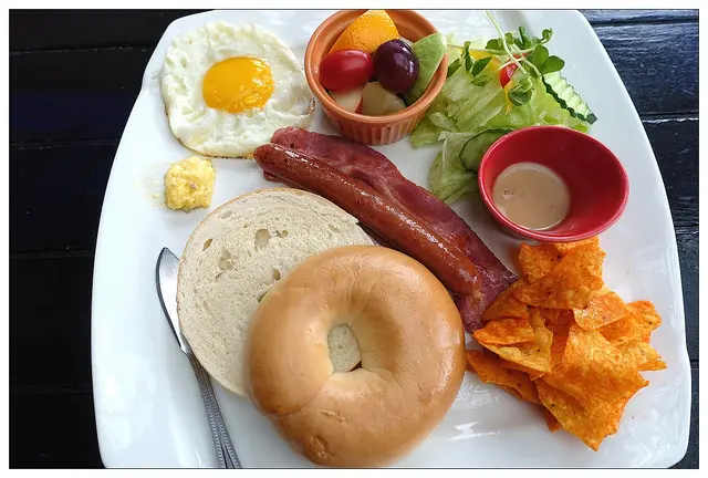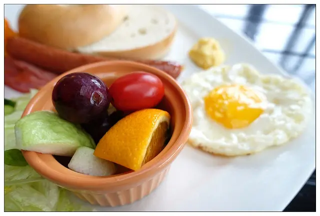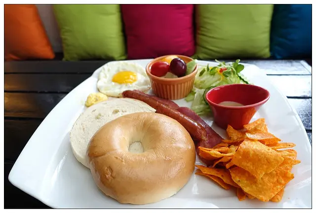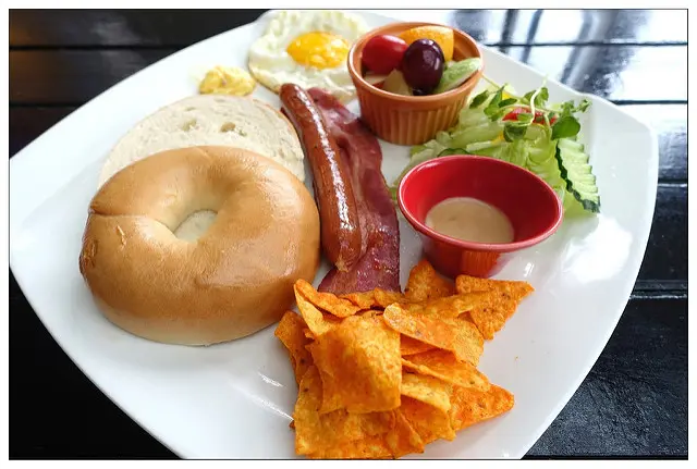 滿滿一盤裡有貝果/德式香腸/培根/太陽蛋/水果沙拉/多力多滋
