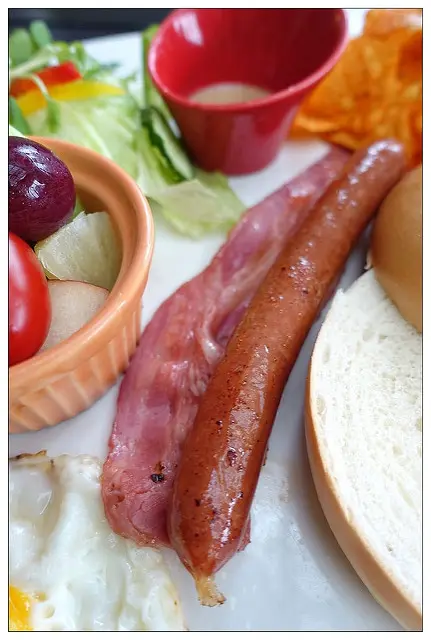 培根煎到嫩多汁~一旁的德國香腸吃起來則是脆口鹹香