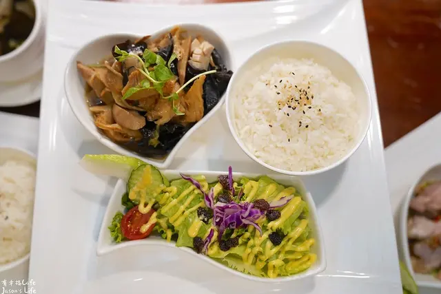 主餐的內容有主食、白飯、沙拉以及湯品