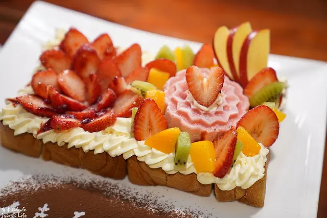 每塊四四方方的蜜糖吐司非常酥脆,搭配酸酸甜甜的水果,很適合當作下午茶